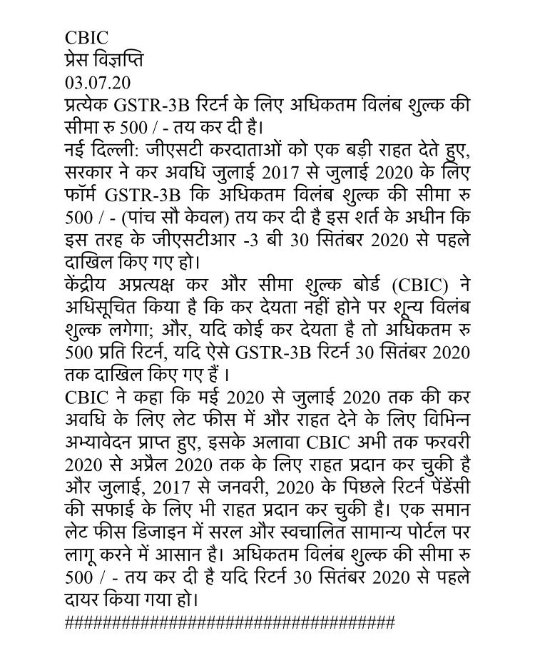 | 24 | 2020 | Press Note dated 03.07.2020 | Title : CBIC New Delhi Press Note dated 03.07.2020 Description : Late Fee Capped at Rs.500/- for each GSTR-3B Return | Title : सीबीआईसी नई दिल्ली प्रेस नोट दिनांक 03.07.2020 Description : प्रत्येक GSTR-3B रिटर्न के लिए लेट फीस 500 / - रु |  |  |