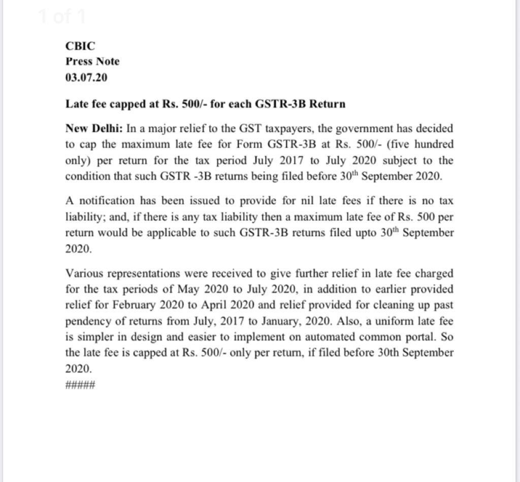 | 25 | 2020 | Press Note dated 03.07.2020 | Title : CBIC New Delhi Press Note dated 03.07.2020 Description : Late Fee Capped at Rs.500/- for each GSTR-3B Return | Title : सीबीआईसी नई दिल्ली प्रेस नोट दिनांक 03.07.2020 Description : प्रत्येक GSTR-3B रिटर्न के लिए लेट फीस 500 / - रु |  |  |