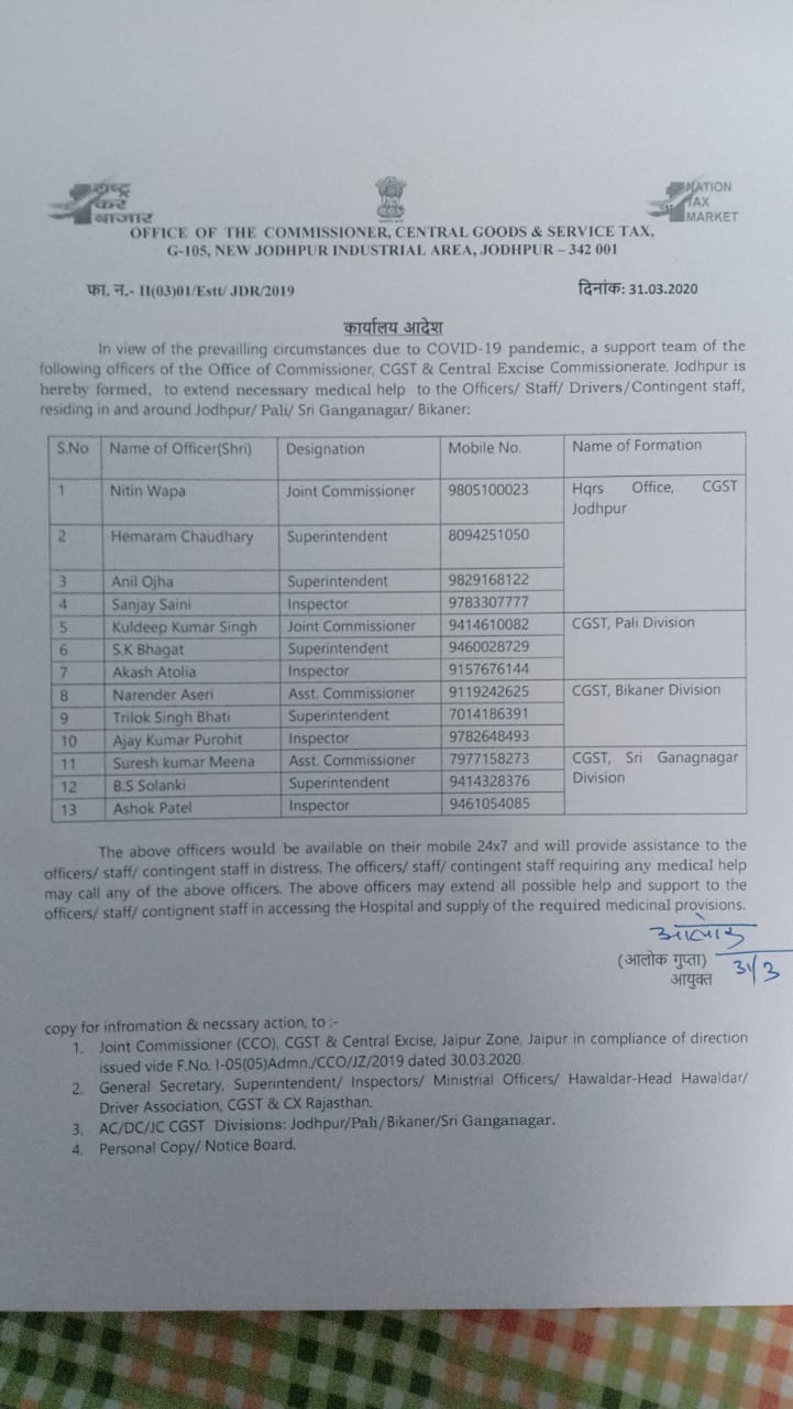 | 293 | 2020 | 31.03.2020 | Title : CGST Jodhpur Office Order dated 31.03.2020 Description : COVID-19 Support network officer formed to extend help to the officers/staff/contingen | Title : सीजीएसटी जोधपुर कार्यालय आदेश दिनांक 31.03.2020 Description : कोविड -19 के सहायता नेट वर्क ऑफिसर का गठन |  |  |